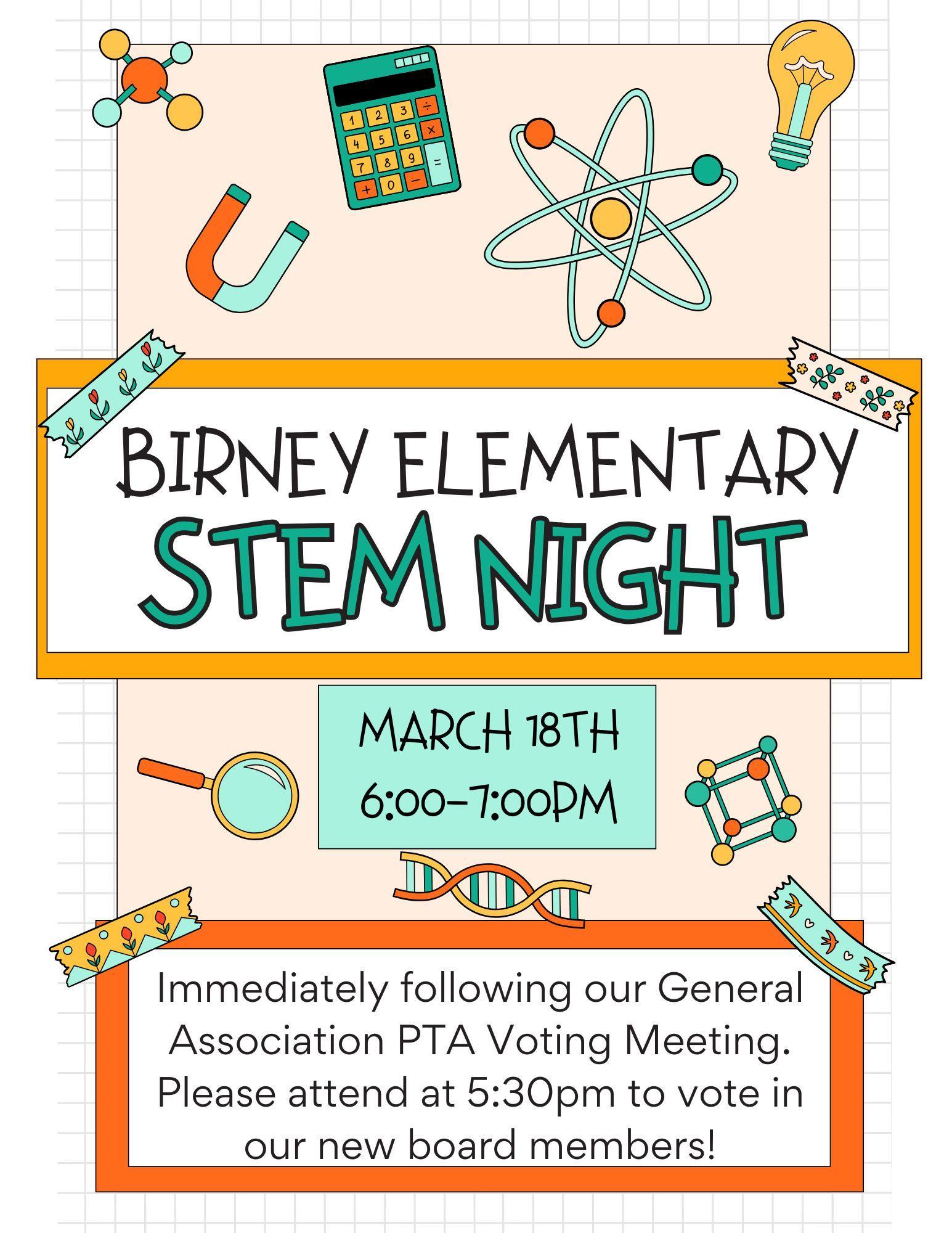 Mark your calendars for Birney’s STEM Night on March 18 from 6-7pm immediately following the PTA General Association Meeting and PTA Board Elections. Come at 5:30 for the PTA Meeting!
