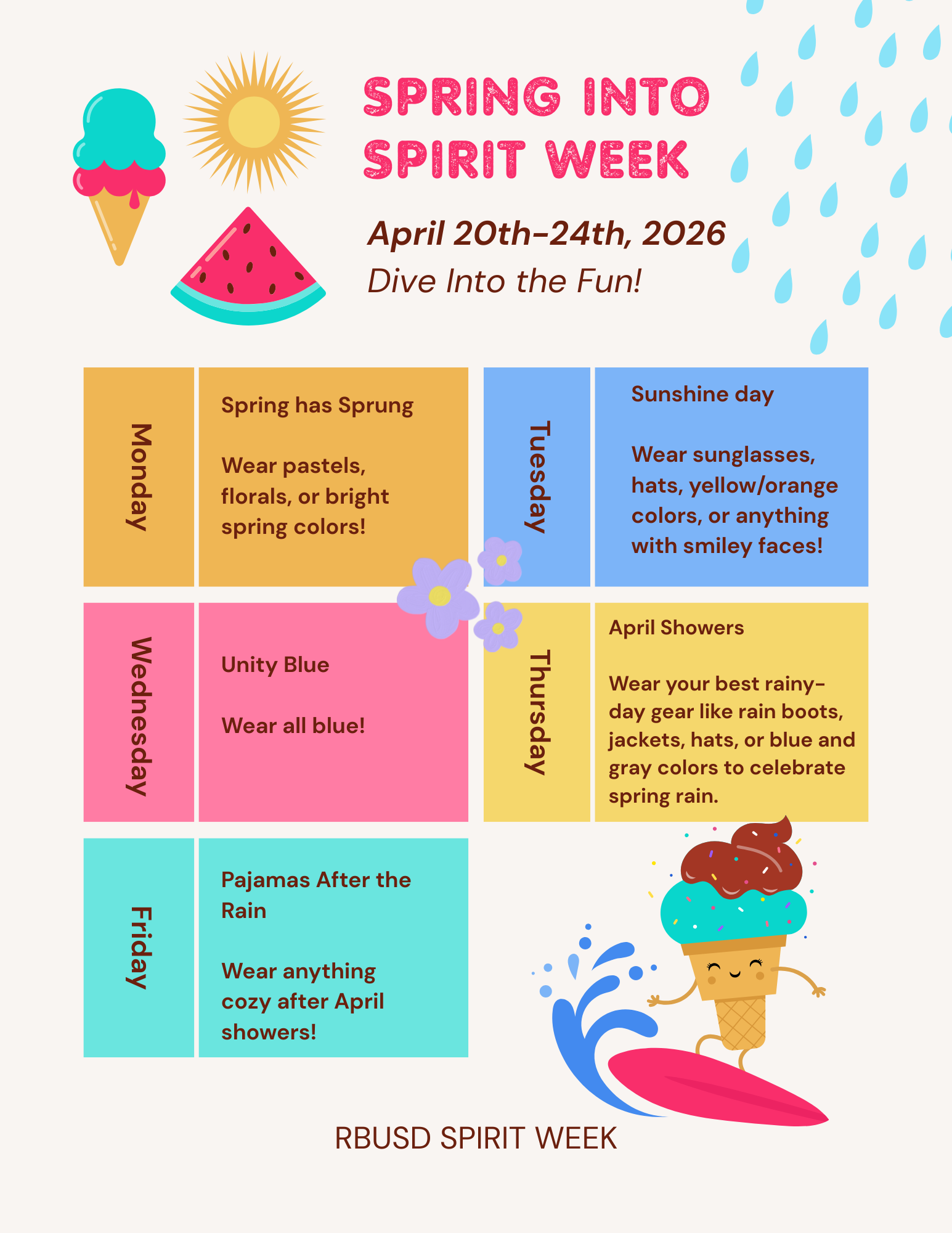 Spring Spirit Week April 20--April 24, 2026 Will be spring spirit week. Please see the attached flyer for all of the fun details!